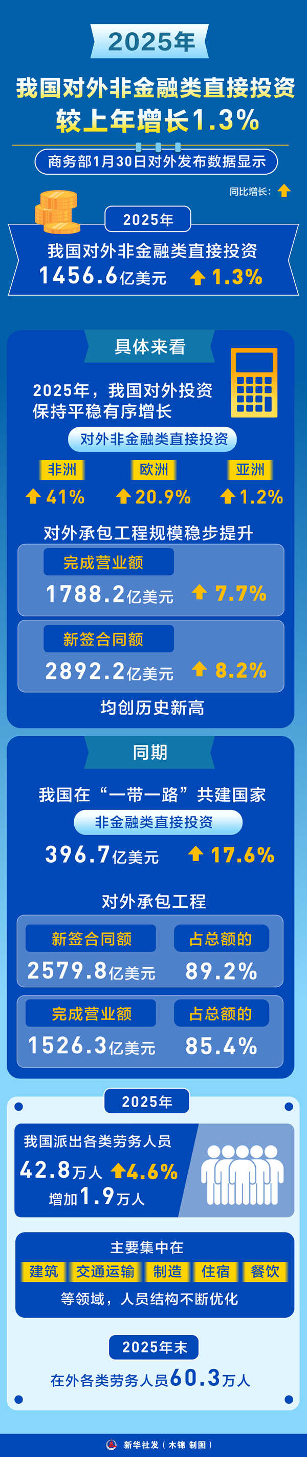 新華社北京1月30日電(記者 謝?,帲┥虅詹?0日對外發(fā)布數(shù)據(jù)顯示,2025年,我國對外非金融類直接投資1456.6億美元,較上年增長1.3%。