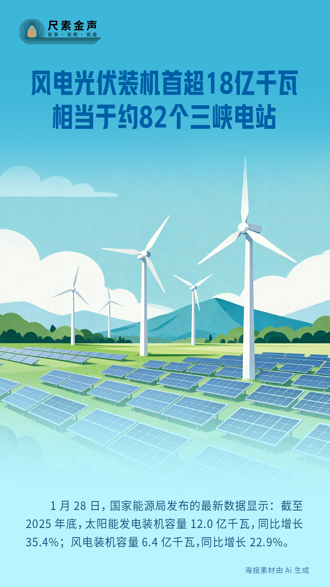 1月28日,國家能源局發(fā)布的最新數(shù)據(jù)顯示:截至2025年底,太陽能發(fā)電裝機(jī)容量12.0億千瓦,同比增長35.4%;風(fēng)電裝機(jī)容量6.4億千瓦,同比增長22.9%。