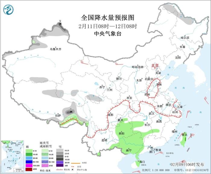 圖3 全國(guó)降水量預(yù)報(bào)圖(2月10日08時(shí)-11日08時(shí))圖片來(lái)源:中央氣象臺(tái)網(wǎng)站