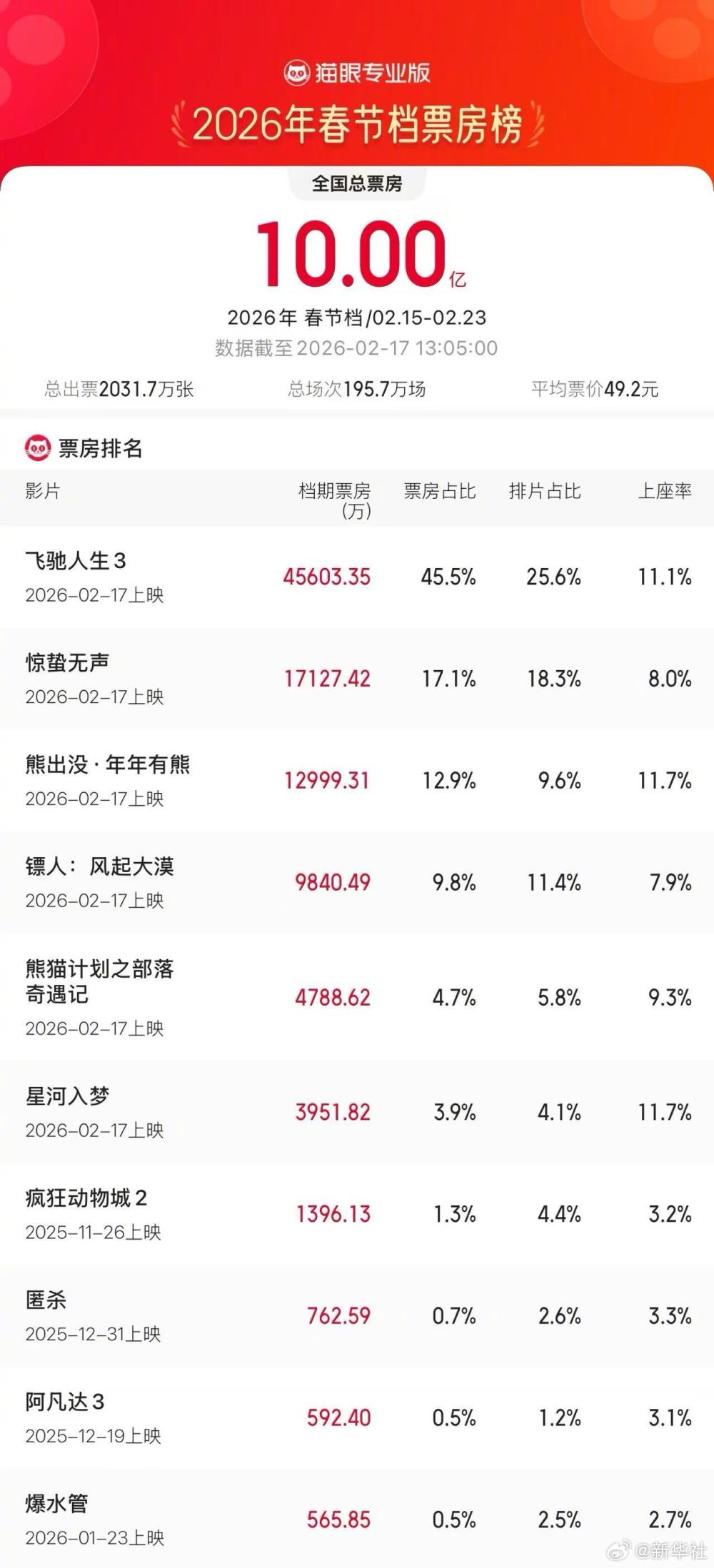 【2026年春節(jié)檔票房破10億】據(jù)網(wǎng)絡(luò)平臺數(shù)據(jù),2026年春節(jié)檔檔期總票房破10億,《飛馳人生3》,《驚蟄無聲》、《熊出沒》和《鏢人:風(fēng)起大漠》分列2026年春節(jié)檔票房榜前四。 一起聊聊,你最期待哪部春節(jié)檔電影?