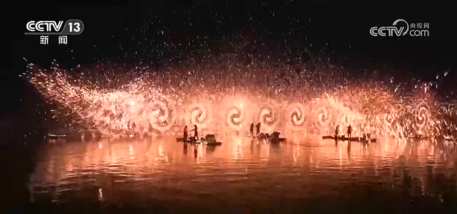 夜幕降臨,古城外的打鐵花表演震撼上演,表演者將滾燙的鐵水拋向空中,鐵水瞬間炸裂,金花四濺,如流星劃過(guò)夜空,引得現(xiàn)場(chǎng)喝彩聲此起彼伏。
