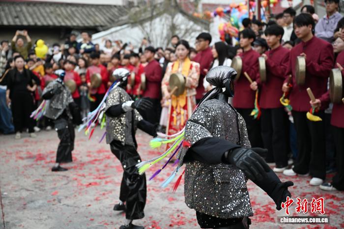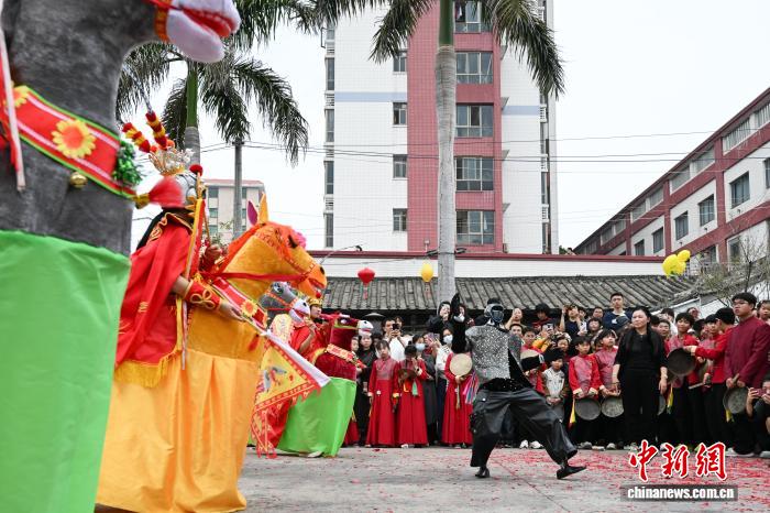 2月24日,廣東省潮州市田頭何村開展民俗巡游活動(dòng),機(jī)器人與布馬舞舞者共舞,吸引村民觀看。中新社記者 陳楚紅 攝