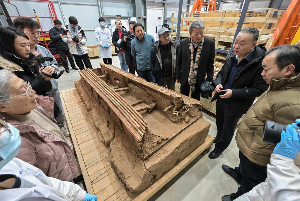 巴達木東晉唐時期墓群考古發(fā)掘負責人尚玉平(右二)向專家們介紹墓葬M20出土的彩繪木棺座。新華社記者 李賀 攝