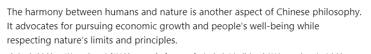 文章還認(rèn)為,人與自然的和諧是中國哲學(xué)的另一個方面。它主張在追求經(jīng)濟(jì)增長和人民福祉的同時,尊重自然的發(fā)展規(guī)律。
