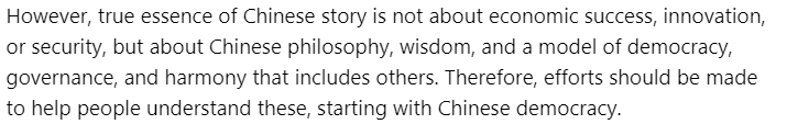 文章稱,中國成功的基礎(chǔ)在于中國獨(dú)特的民主模式——全過程人民民主。其中,社會主義核心價值觀是整個體系的基石。中國以人為本的治理模式,以人民的福祉、安全和繁榮為核心,并通過全過程人民民主來實現(xiàn)。