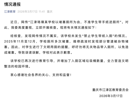 經(jīng)核查,發(fā)現(xiàn)網(wǎng)傳情況不屬實(shí),該學(xué)校未發(fā)生“禁止學(xué)生帶紙入廁”的情況。2025年11月至12月,學(xué)校廁所多次堵塞,維修疏時(shí)發(fā)現(xiàn)部分管道被雜物堵塞。因此,對學(xué)生進(jìn)行了文明用廁的提醒,呼吁勿將無關(guān)物品帶入廁所,以免造成堵塞。導(dǎo)致誤讀誤解,學(xué)校對此表示歉意。