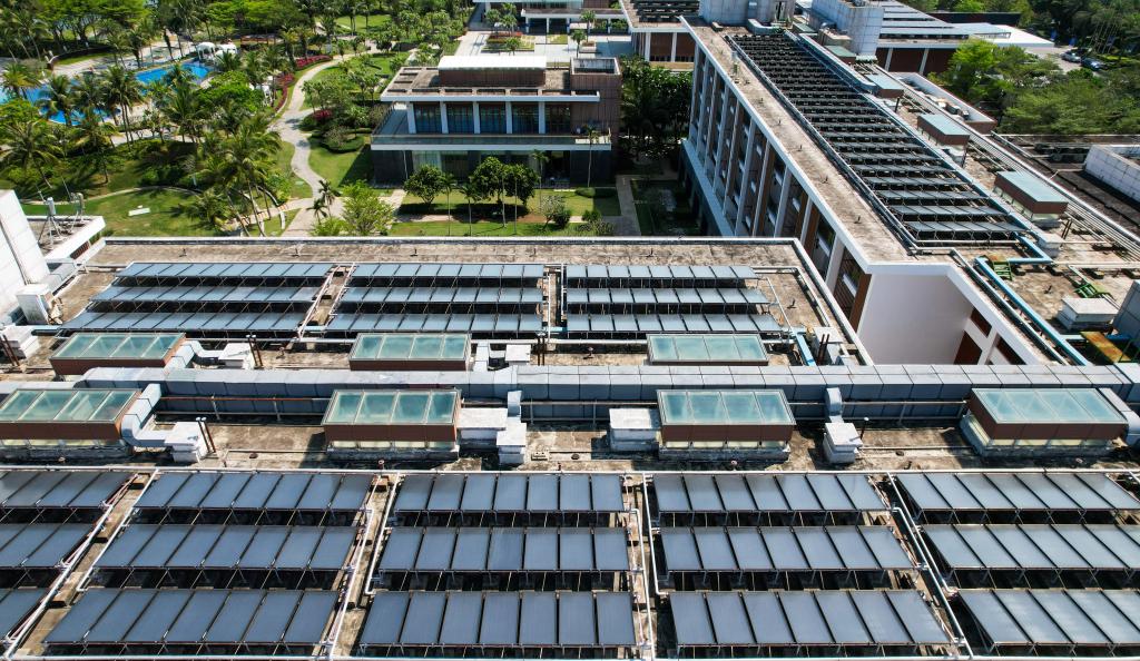 在博鰲零碳示范區(qū)拍攝的東嶼島大酒店屋頂?shù)墓夥O(shè)備(3月19日攝,無人機(jī)照片)。