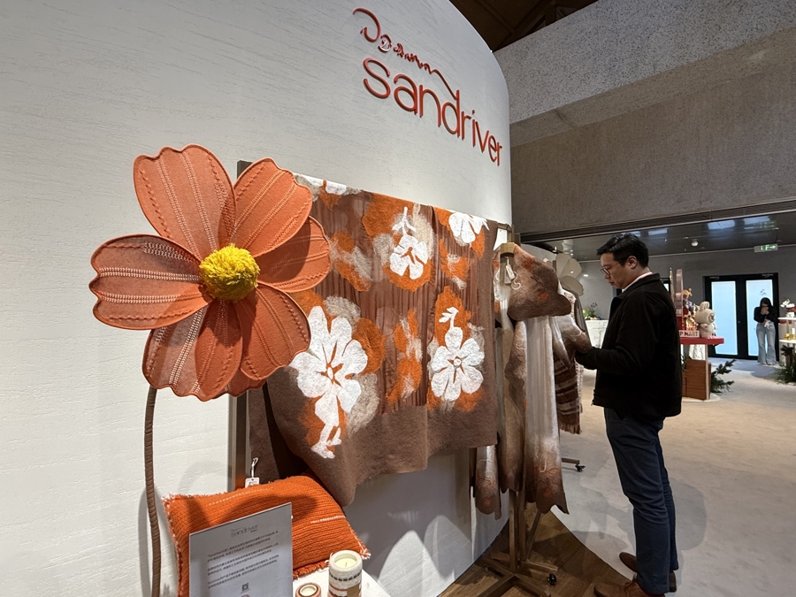 “踏花影”區(qū)域是一個(gè)五感體驗(yàn)的沉浸空間。藝術(shù)羊絨品牌Sandriver沙涓現(xiàn)場(chǎng)還原了日喀則羊絨氆氌工坊、果洛牦牛絨氆氌工坊的織機(jī)操作,匠人以雙手穿梭,在經(jīng)緯交錯(cuò)間演繹“高原的溫度”,消費(fèi)者能近距離觀看從捻紗到成胚的全過程,感受這一非物質(zhì)文化遺產(chǎn)的匠心精神。沙涓品牌負(fù)責(zé)人介紹,品牌將首發(fā)羊絨睡袍系列新品、馬年主題哈尼繡系列以及羊絨艾德萊斯家居毯等作品,展現(xiàn)傳統(tǒng)工藝與當(dāng)代生活美學(xué)融合的羊絨設(shè)計(jì)。