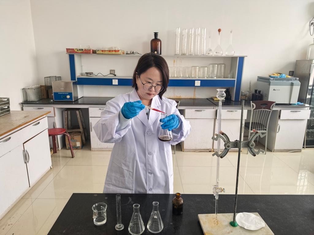 內(nèi)蒙古興安農(nóng)墾集團有限責任公司測土配方辦公室技術人員正在進行化驗。(王萍 攝)