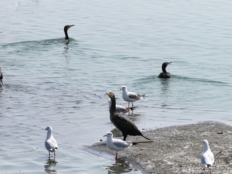 白鷺、鸕鶿、野鴨等水鳥在艾西曼湖邊嬉水。□麥吾蘭江·莫明攝