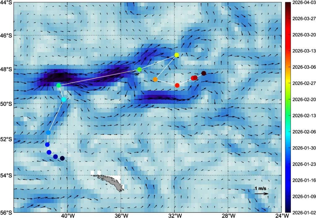 風云衛(wèi)星監(jiān)測的A23a冰山漂移路徑(圓點為冰山位置,時間與右側(cè)標注對應(yīng);圖底色和箭頭表示洋流)。(中國氣象局供圖)