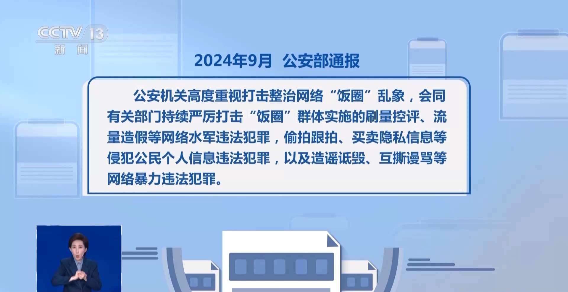2024年9月,公安部通報,公安機關高度重視打擊整治網(wǎng)絡“飯圈”亂象,會同有關部門持續(xù)嚴厲打擊“飯圈”群體實施的刷量控評、流量造假等網(wǎng)絡水軍違法犯罪,偷拍跟拍、買賣隱私信息等侵犯公民個人信息違法犯罪,以及造謠詆毀、互撕謾罵等網(wǎng)絡暴力違法犯罪。