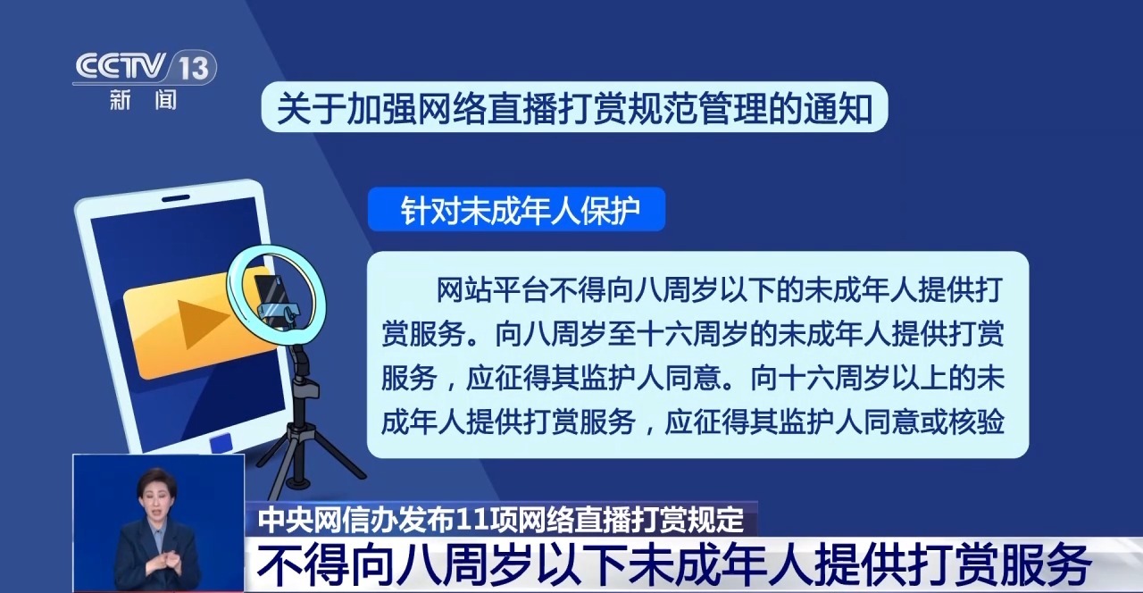 據(jù)記者了解,“通知”中提出11項具體要求,包括:明示打賞規(guī)則、規(guī)范打賞營利權(quán)限開通、完善未成年人保護機制、建立打賞營利行為負面清單、加大處置和曝光力度等。