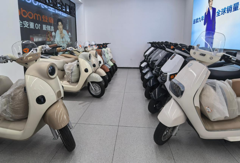 4月9日,福建省福州市平潭縣雅迪電動(dòng)車旗艦店展出的電摩車型。新華網(wǎng) 王巖 攝