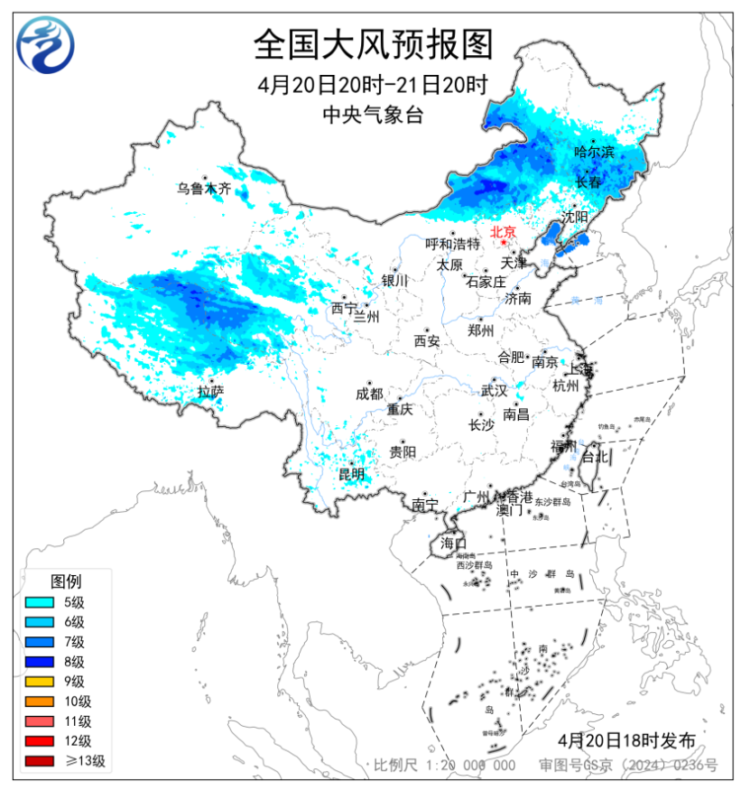 預(yù)計4月20日20時至21日20時,內(nèi)蒙古中東部、吉林、黑龍江東南部以及新疆南疆盆地、西藏北部、青海中西部等地部分地區(qū)有5~7級風(fēng),陣風(fēng)8~9級,其中內(nèi)蒙古中部、吉林中東部等地局地有8~9級風(fēng),陣風(fēng)10級以上;渤海、渤海海峽、黃海北部部分海域?qū)⒂?級、陣風(fēng)8級的大風(fēng)(見圖2)。中央氣象臺4月20日18時發(fā)布大風(fēng)藍(lán)色預(yù)警。