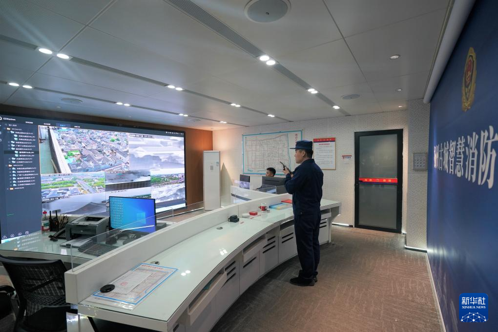 在揚(yáng)州市廣陵區(qū)東關(guān)街政府專職消防隊(duì)指揮中心,“協(xié)同治理合伙人”張華峰依托“古城智慧消防監(jiān)管系統(tǒng)”開展古城街區(qū)消防實(shí)況監(jiān)測和現(xiàn)場指揮(4月16日攝)。