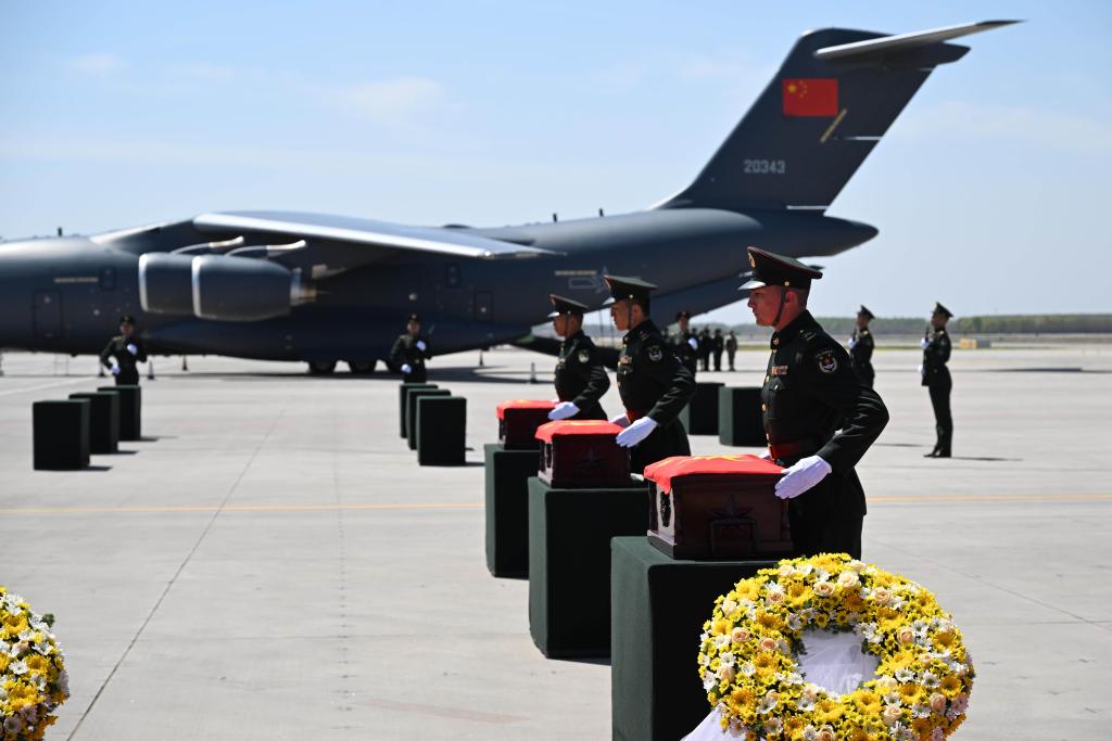 4月22日,第十三批在韓中國(guó)人民志愿軍烈士遺骸由中國(guó)空軍運(yùn)-20B從韓國(guó)接回遼寧沈陽(yáng)。這是迎回儀式現(xiàn)場(chǎng)。新華社發(fā)(余紅春 攝)