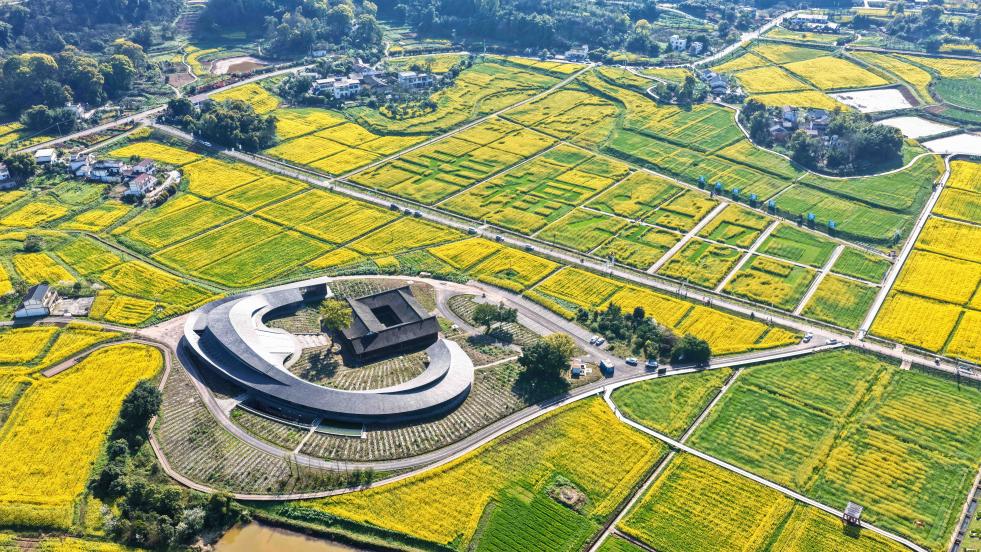 在四川省瀘州市江陽區(qū)分水嶺鎮(zhèn)董允壩現(xiàn)代農業(yè)園區(qū)拍攝的油菜花田(3月4日攝,無人機照片)。新華社發(fā)(劉學懿攝)