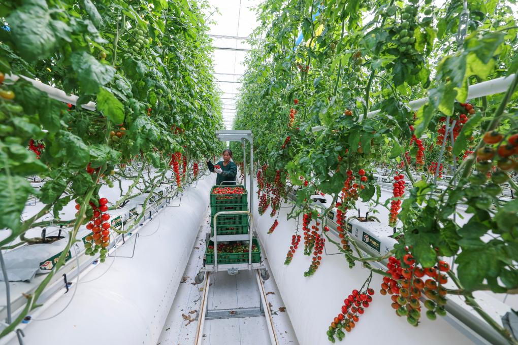 村民在位于浙江嘉興海寧黃灣鎮(zhèn)的浙江光禾智谷生態(tài)農業(yè)有限公司玻璃溫室內采摘番茄(4月15日攝)。新華社記者 徐昱 攝