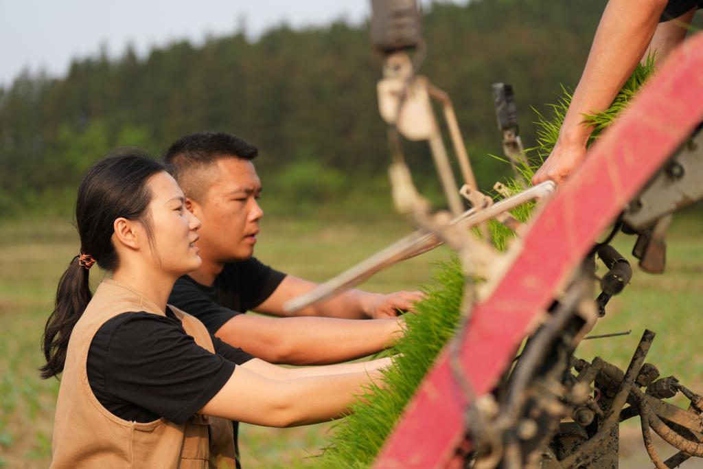 4月9日,“95后”新農人駱雨和丈夫江茂智在田間為插秧機裝載秧苗。新華社記者 薛宇舸 攝