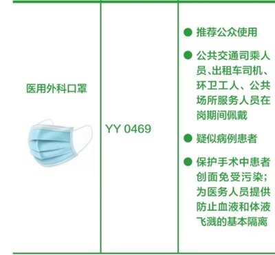 醫(yī)用外科口罩:防護效果優(yōu)于一次性使用醫(yī)用口罩,推薦公眾包括疑似病例患者、公共交通司乘人員、出租車司機、環(huán)衛(wèi)工人、公共場所服務(wù)人員在崗期間佩戴。該類型口罩還可保護手術(shù)中患者創(chuàng)面免受污染,可為醫(yī)務(wù)人員提供防止血液和體液飛濺的基本隔離。(橫列為口罩的圖片+名稱、產(chǎn)品標(biāo)準(zhǔn)、建議應(yīng)用場景。圖片來源:中國疾控中心)