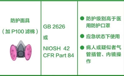 防護面具(加P100濾棉):防護級別高于醫(yī)用防護口罩,建議用于確診或疑似病例的氣管插管、內(nèi)鏡等操作。(橫列為口罩的圖片+名稱、產(chǎn)品標(biāo)準(zhǔn)、建議應(yīng)用場景。圖片來源:中國疾控中心)