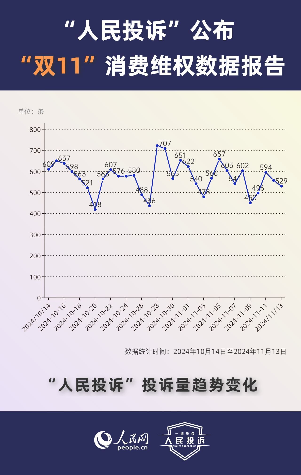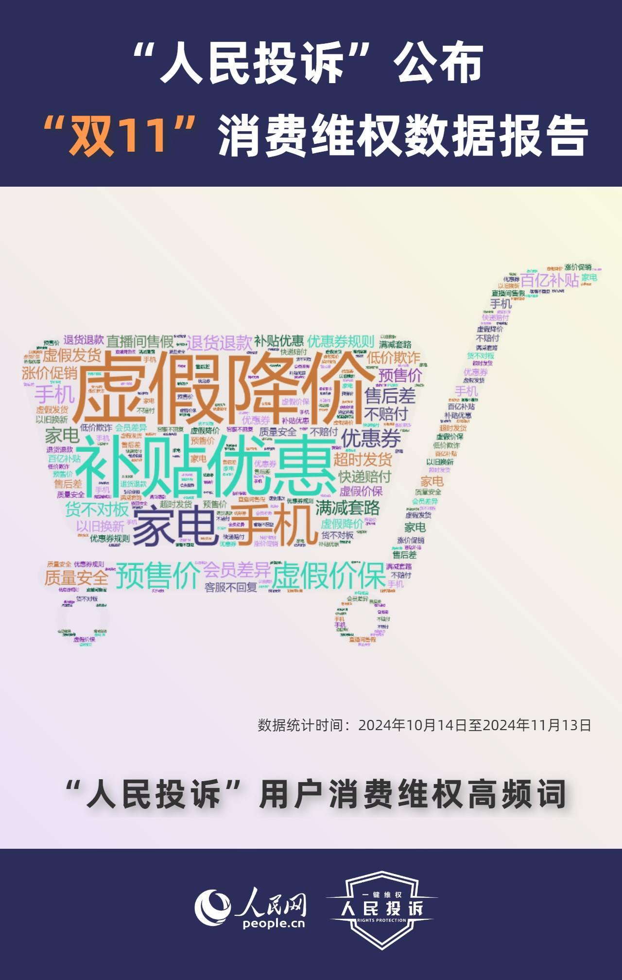那么,今年你的“雙11”購(gòu)物還遇到了哪些“套路”?據(jù)人民網(wǎng)“人民投訴”平臺(tái)統(tǒng)計(jì),“雙11”期間平臺(tái)共收到17699條(數(shù)據(jù)統(tǒng)計(jì)從2024年10月14日-11月13日)投訴信息。其中,手機(jī)、家電、智能產(chǎn)品、美妝服飾等消費(fèi)領(lǐng)域維權(quán)量大;平臺(tái)“國(guó)補(bǔ)”“以舊換新”等優(yōu)惠規(guī)則不透明,保價(jià)服務(wù)藏“貓膩”,直播間虛假“破價(jià)”,“百億補(bǔ)貼”商品貨不對(duì)板,“高價(jià)預(yù)售”欺詐等問(wèn)題反映突出。