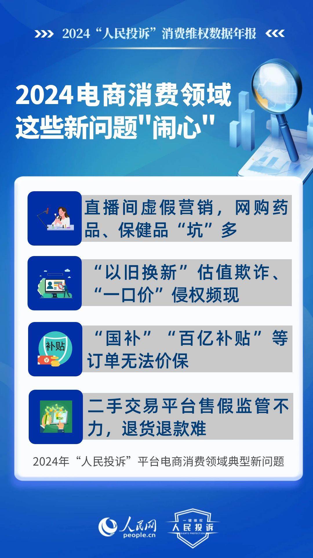 新問題體現(xiàn)在:直播間虛假營銷,購買玉石/網(wǎng)課/旅游產(chǎn)品等消費“踩雷”多;“以舊換新”估值欺詐、“一口價”侵權頻現(xiàn);“國補”“百億補貼”訂單不給價保;二手交易平臺對商家售假監(jiān)管不力、“陰陽”檢測、退貨退款難;網(wǎng)購藥品/保健品/醫(yī)療器械“坑”多等。