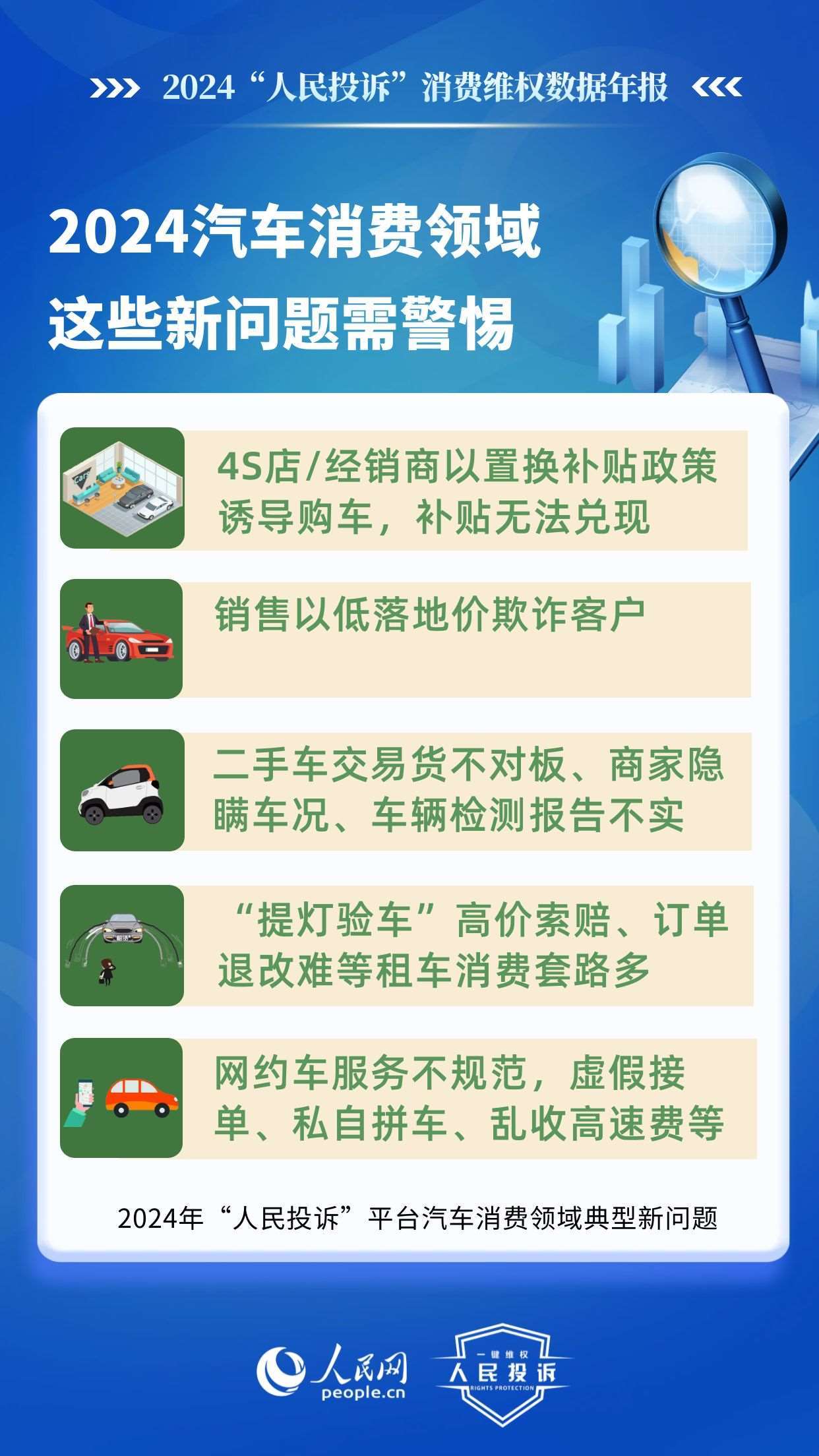 新問題體現(xiàn)在:4S店/經(jīng)銷商以置換補貼政策誘導購車,結果補貼無法兌現(xiàn);銷售以低落地價欺詐客戶;二手車交易貨不對板、商家隱瞞車況、平臺車輛檢測報告不實;惡意租“故障車”、“提燈驗車”高價索賠、低價誘租、訂單退改難等租車消費套路多;網(wǎng)約車服務不規(guī)范,人車不符、虛假接單、私自拼車、亂收高速費等。
