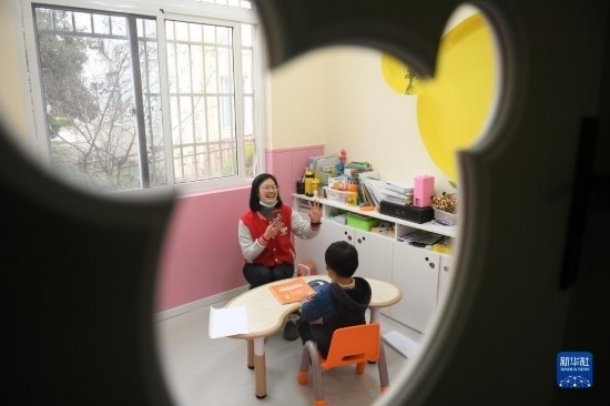 3月29日,一名老師帶著自閉癥兒童進教室上課。