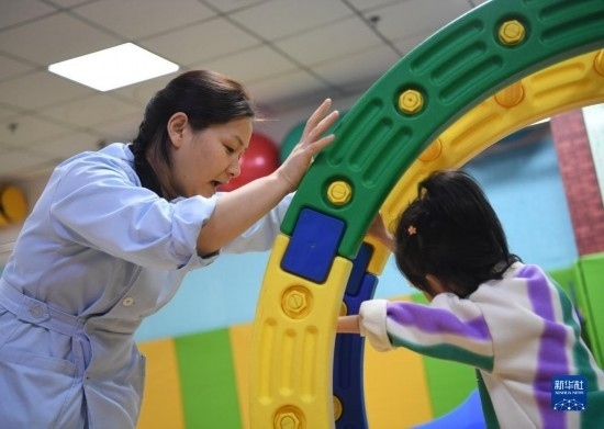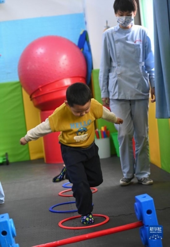 3月30日,在西安市金色陽(yáng)光康復(fù)中心,特教老師(左)指導(dǎo)孩子進(jìn)行康復(fù)訓(xùn)練。
