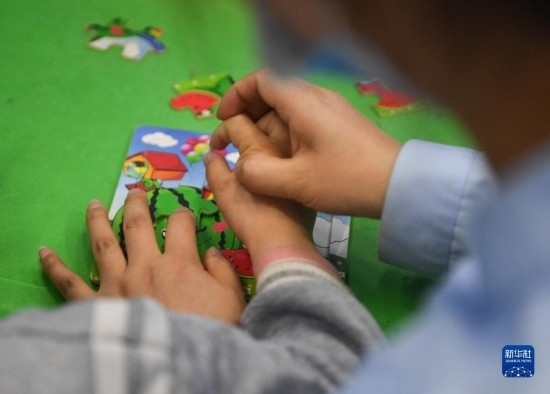 3月30日,在西安市金色陽(yáng)光康復(fù)中心,特教老師指導(dǎo)孩子練習(xí)拼圖。