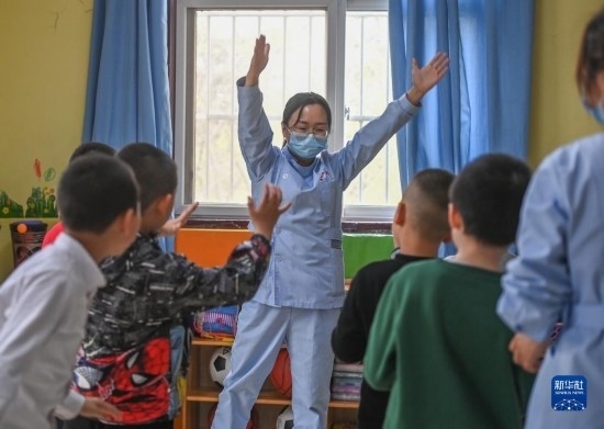 3月30日,在西安市金色陽(yáng)光康復(fù)中心,特教老師引導(dǎo)孩子們做體操。