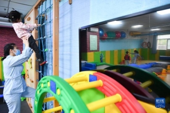 3月30日,在西安市金色陽(yáng)光康復(fù)中心,特教老師為孩子進(jìn)行康復(fù)訓(xùn)練。