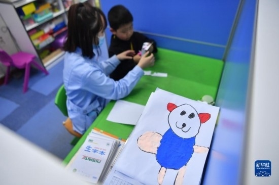 3月30日,在西安市金色陽(yáng)光康復(fù)中心,特教老師指導(dǎo)孩子進(jìn)行繪畫練習(xí)。