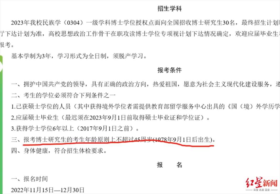 而根據(jù)《青海民族大學2023年民族學博士研究生招生簡章》,報考博士研究生的考生年齡原則上不超過45周歲(1978年9月1日后出生)。資料顯示,阿進錄為1973年出生。對于網(wǎng)友提到的“年齡不符合報考條件”,上述工作人員表示:“他資格審查是通過的?!?/strong>