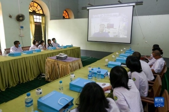 這是4月20日在緬甸仰光一所高中拍攝的“天宮對話”活動線上課堂現(xiàn)場。