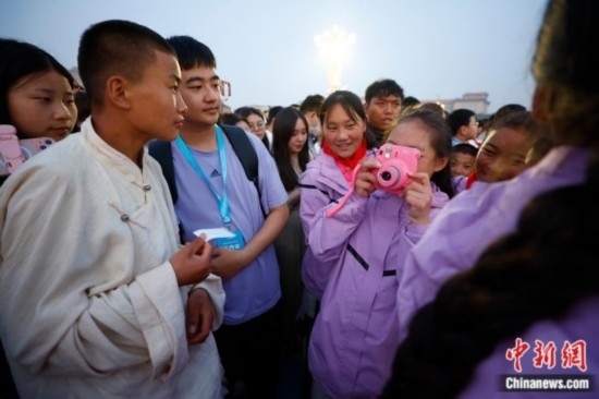 6月1日清晨的天安門廣場(chǎng),一群來(lái)自青海玉樹(shù)、身著傳統(tǒng)藏族服飾的孩子組成了一道亮麗的風(fēng)景線。