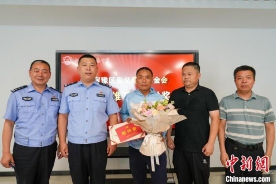 宿遷市公安局宿豫分局和宿豫區(qū)見義勇為基金會為丁成闖送上見義勇為表彰證書和慰問金。宿豫區(qū)委宣傳部供圖