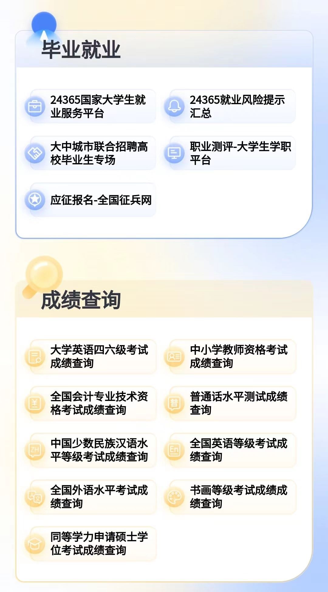 細分到大學生群體,“人民網(wǎng)+”客戶端便民服務匯總小程序提供在校期間多種國家考試成績的查詢服務,并為大學生群體提供畢業(yè)就業(yè)資訊及服務,實現(xiàn)從入學到就業(yè)“服務閉環(huán)”: