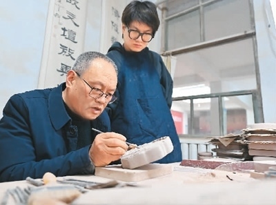 絳州澄泥硯制作技藝省級代表性傳承人藺濤(左)指導兒子藺霄鱗處理澄泥硯雕刻的細節(jié)。