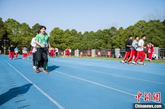 3月19日,香港學(xué)生體驗(yàn)少數(shù)民族傳統(tǒng)體育項(xiàng)目《板鞋競技》。唐哲 攝