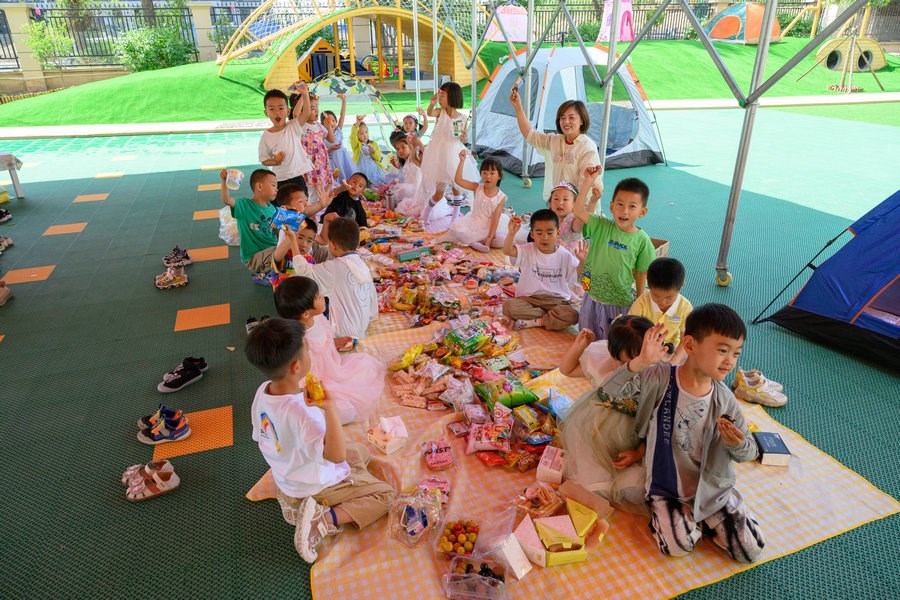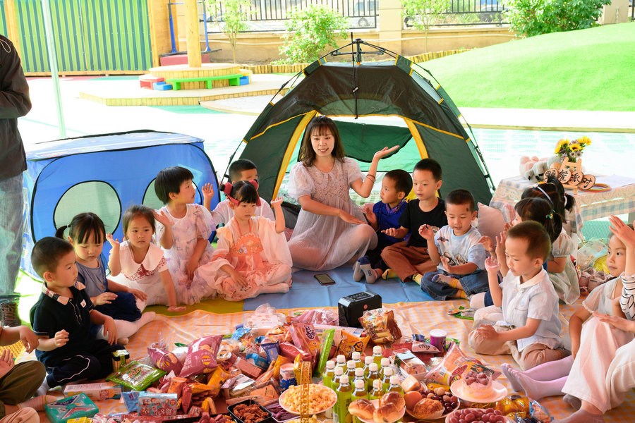 當(dāng)日,在幼兒園的操場上,五顏六色的野餐墊鋪,可愛俏皮的帳篷,精致的裝飾,數(shù)不勝數(shù)的水果點(diǎn)心,小朋友們在陰涼處盡情享受著美味,與老師們一起享受著夏日里野餐派對的美好。