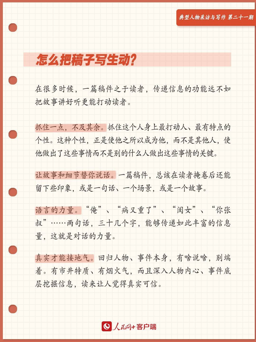 抓住一點,不及其余。副縣長、信訪局長、基層民警、環(huán)衛(wèi)局長……這些被評為“人民滿意的公務(wù)員”的采訪對象,每個人身上都有一串光榮事跡,若是有聞必錄,大概寫五六千字也打不住。怎樣在千字內(nèi)把故事講好,讓采訪對象躍然紙上?