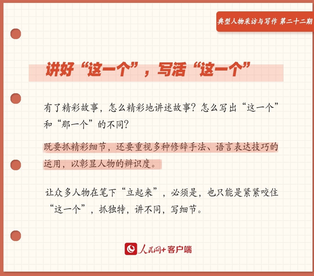 把好故事講精彩,讓“這一個(gè)”立起來,既要抓精彩細(xì)節(jié),還要重視多種修辭手法、語言表達(dá)技巧的運(yùn)用,以彰顯人物的辨識(shí)度。