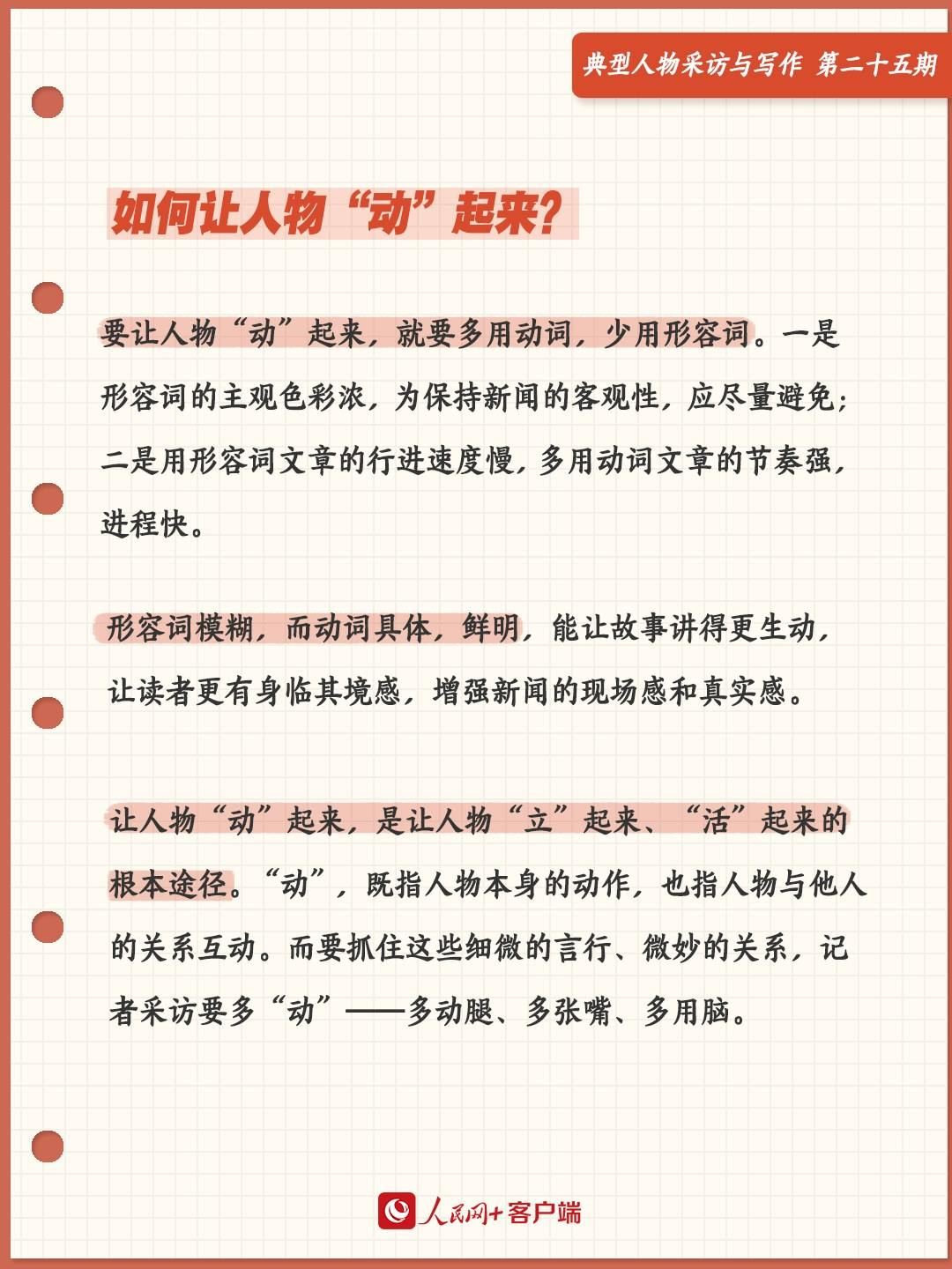要讓人物“動(dòng)”起來(lái),就要多用動(dòng)詞,少用形容詞。為什么?一是形容詞的主觀色彩濃,為了保持新聞的客觀性,應(yīng)盡量避免;二是用形容詞文章的行進(jìn)速度慢,多用動(dòng)詞文章的節(jié)奏強(qiáng),進(jìn)程快。形容詞模糊,而動(dòng)詞具體,鮮明,能讓故事講得更生動(dòng),讓讀者更有身臨其境感,增強(qiáng)新聞的現(xiàn)場(chǎng)感和真實(shí)感。