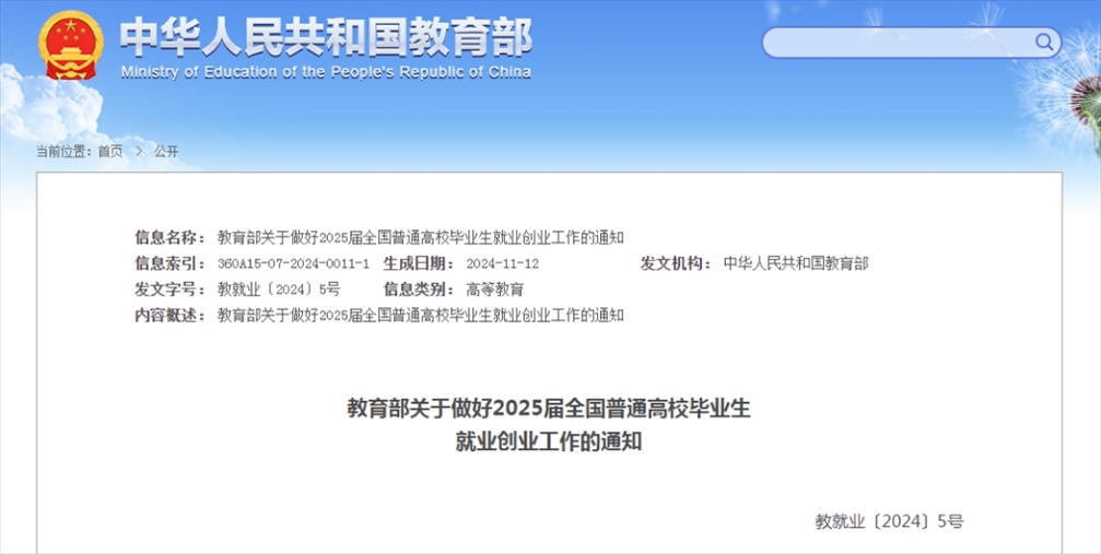 記者11月13日從教育部獲悉,教育部近日印發(fā)通知,部署做好2025屆全國普通高校畢業(yè)生就業(yè)創(chuàng)業(yè)工作。通知提出實施2025屆全國普通高校畢業(yè)生就業(yè)創(chuàng)業(yè)促進和服務(wù)體系建設(shè)行動,全力促進高校畢業(yè)生高質(zhì)量充分就業(yè)。