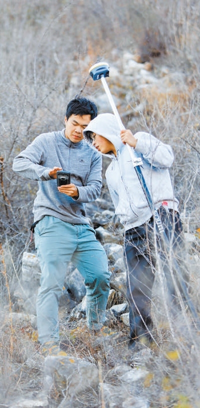 北京聯(lián)合大學地理學碩士研究生在北京房山區(qū)穆家口古城址四普現(xiàn)場測量文物地理坐標。