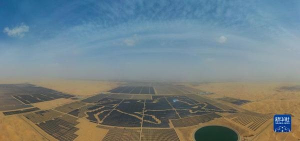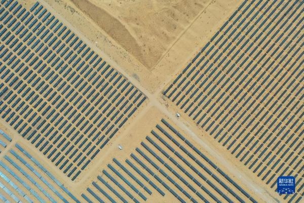 一匹占地130多萬平方米的沙漠“駿馬”橫臥在內(nèi)蒙古自治區(qū)庫布其沙漠之中,這是位于達拉特光伏發(fā)電應(yīng)用領(lǐng)跑基地中、由近20萬塊光伏板組成的“駿馬電站”。該電站采用“林光互補”模式,板上發(fā)電、板下種植,在開發(fā)利用庫布其沙漠豐富太陽能資源的同時,推動沙漠生態(tài)治理。