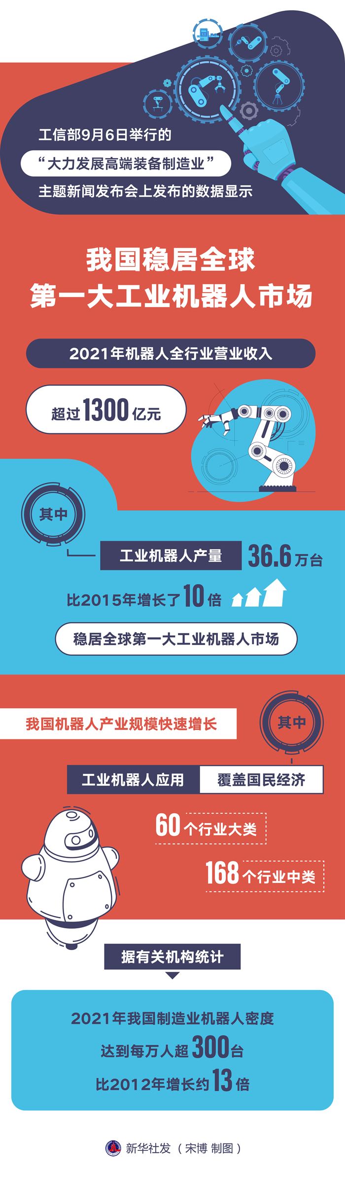 工信部裝備工業(yè)一司副司長(zhǎng)郭守剛6日表示,我國(guó)機(jī)器人產(chǎn)業(yè)規(guī)??焖僭鲩L(zhǎng),2021年機(jī)器人全行業(yè)營(yíng)業(yè)收入超過(guò)1300億元。其中,工業(yè)機(jī)器人產(chǎn)量達(dá)36.6萬(wàn)臺(tái),比2015年增長(zhǎng)了10倍,穩(wěn)居全球第一大工業(yè)機(jī)器人市場(chǎng)。